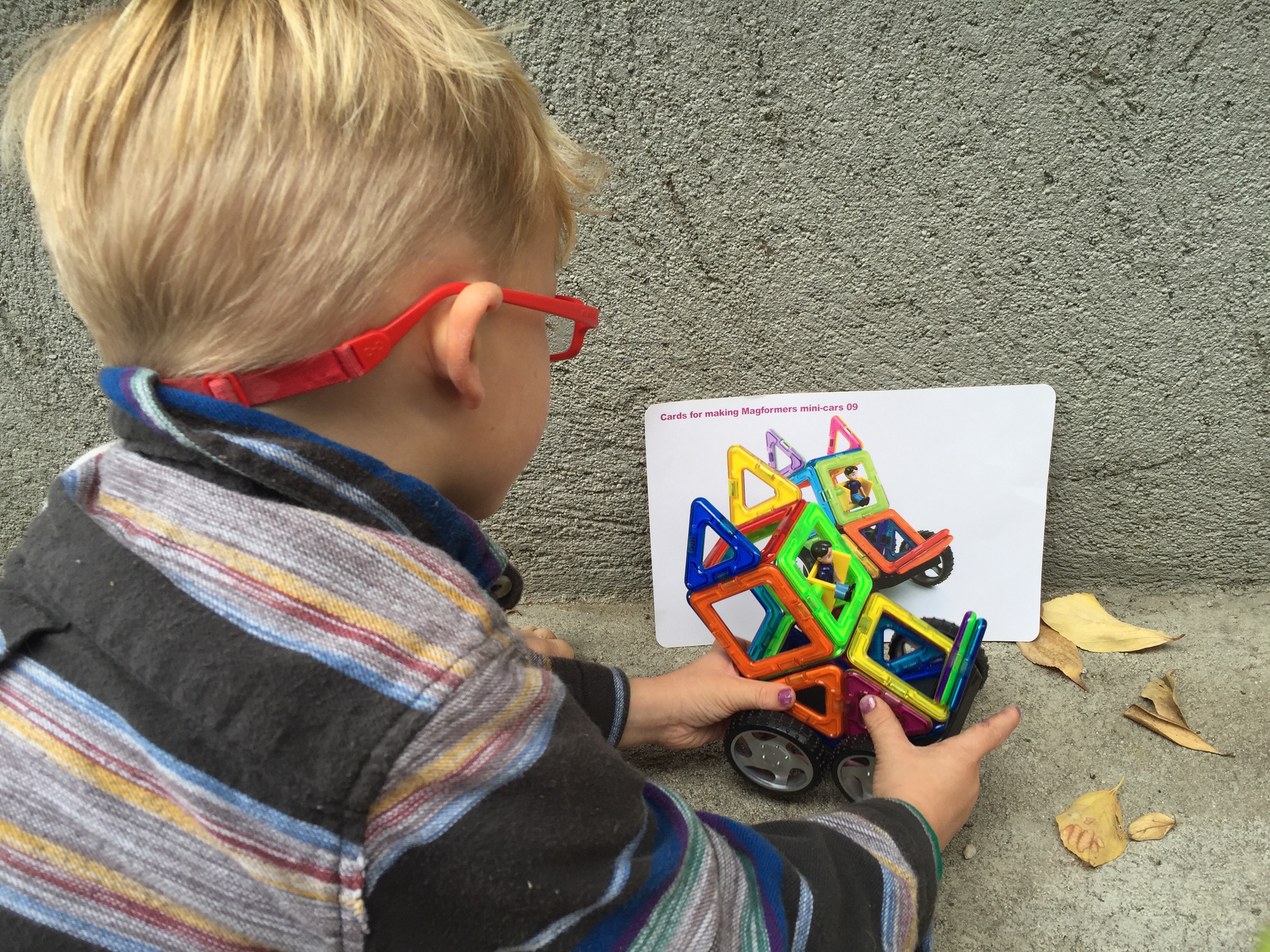 When he looks at a photo of a race car made of Magformers and tries to build what he sees.